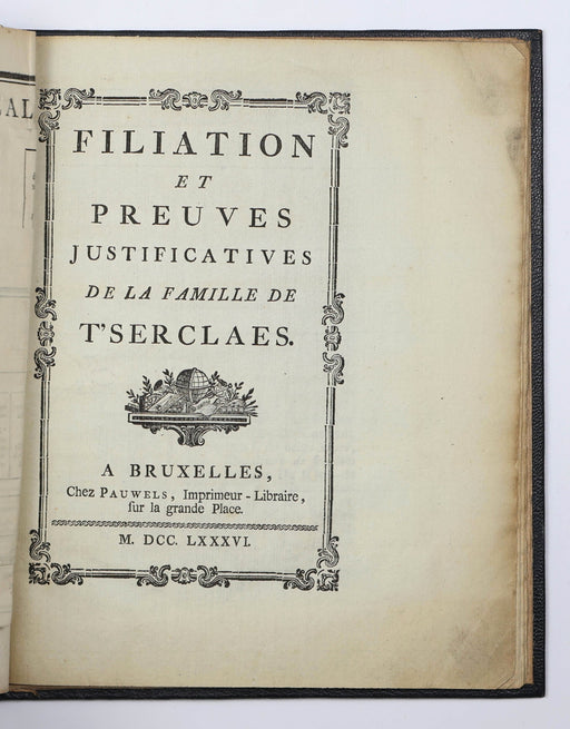 T'Serclaes familyOriginal price £250.00 - Original price £250.00Original price£250.00£250.00 - £250.00Current price £250.00| /[T'Serclaes family] Filiation et preuves justificatives de la famille de T’Serclaes. Bruxelles [i.e. Brussels], Chez Pauwels, 1786. Only edition of...