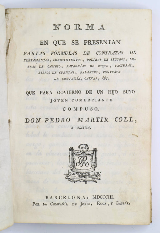 Coll y Alsina, Pedro MartirOriginal price £350.00 - Original price £350.00Original price£350.00£350.00 - £350.00Current price £350.00| /Coll y Alsina, Pedro Martir: Norma, en que se presentan varias formulas de contratas de fletamentos, conocimientos, pólizas de seguros, letras de c...