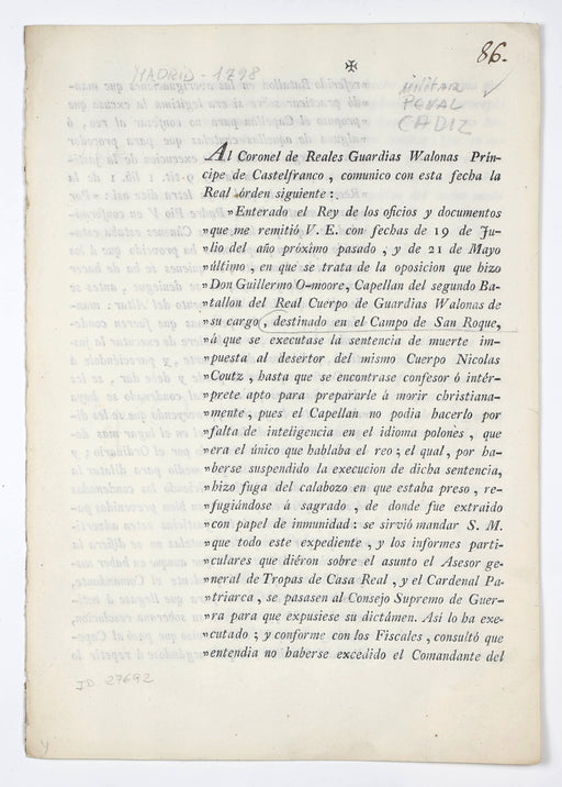 Real OrdenOriginal price £190.00 - Original price £190.00Original price£190.00£190.00 - £190.00Current price £190.00| /[Real Orden:] [Begins: 'Al Coronel de Reales Guardias Walonas Principe de Castelfranco, comunico con esta fecha la Real órden siguiente']. [Madrid]...