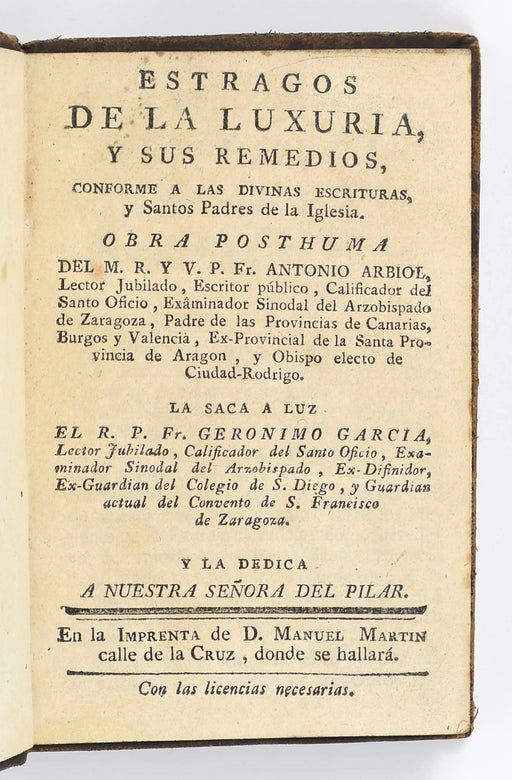 Arbiol, Antonio (O.F.M.); García, Gerónimo (O.F.M.) (ed.)Original price £120.00 - Original price £120.00Original price£120.00£120.00 - £120.00Current price £120.00| /Arbiol, Antonio, O.F.M. [García, Gerónimo, O.F.M.]: Estragos de la luxuria y sus remedios, conforme a las divinas escrituras, y Santos Padres de la...