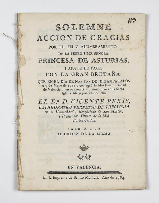 Peris y Pascual, Vicente deOriginal price £175.00 - Original price £175.00Original price£175.00£175.00 - £175.00Current price £175.00| /Peris y Pascual, Vicente de: Solemne accion de gracias por el feliz alumbramiento de la serenisima señora Princesa de Asturias, i ajuste de paces c...