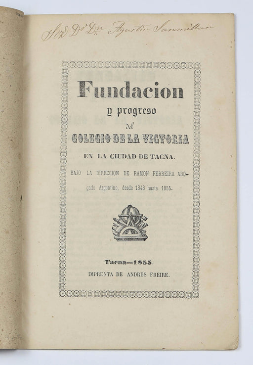 Ferreira, RamónOriginal price £140.00 - Original price £140.00Original price£140.00£140.00 - £140.00Current price £140.00| /[Peru] [Ferreira, Ramón:] Fundacion y progreso del Colegio de la Victoria en la ciudad de Tacna. Bajo la direccion de Ramon Ferreira abogado Argent...