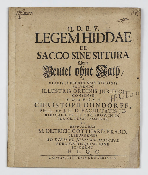 Dondorff, Christoph (praes); Ekard, Dietrich Gotthard (resp.):Original price £250.00 - Original price £250.00Original price£250.00£250.00 - £250.00Current price £250.00| /Dondorff, Christoph (praes.:) [Ekard, Dietrich Gotthard (resp.):] Legem Hiddae de sacco sine sutura. vom Beutel ohne Rath, a viduis Ildeburgensis d...