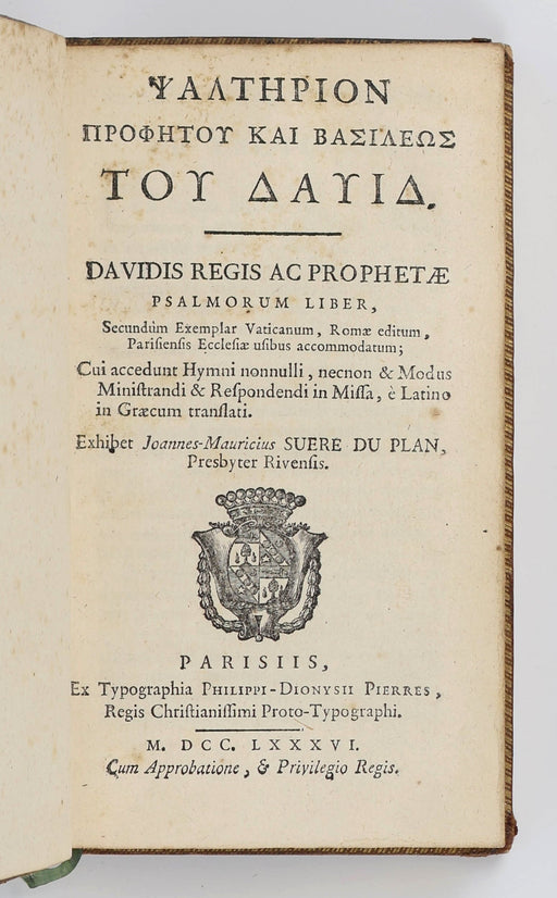 Psalms; Suère du Plan, Jean-MauriceOriginal price £350.00 - Original price £350.00Original price£350.00£350.00 - £350.00Current price £350.00| /[Psalms] Suère du Plan, Jean-Maurice: [Greek letters] Psalterion Profetou kai Basileos tou David. Davidis regis et prophetae psalmorum liber, secun...