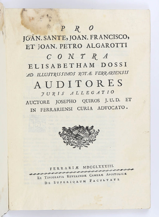 Quiros, GiuseppeOriginal price £55.00 - Original price £55.00Original price£55.00£55.00 - £55.00Current price £55.00| /Quiros, Giuseppe: Pro Joan. Sante, Joan. Francisco, et Joan. Petro Algarotti contra Elisabetham Dossi. Ad illustrissimos Rotae Ferrariensis auditor...