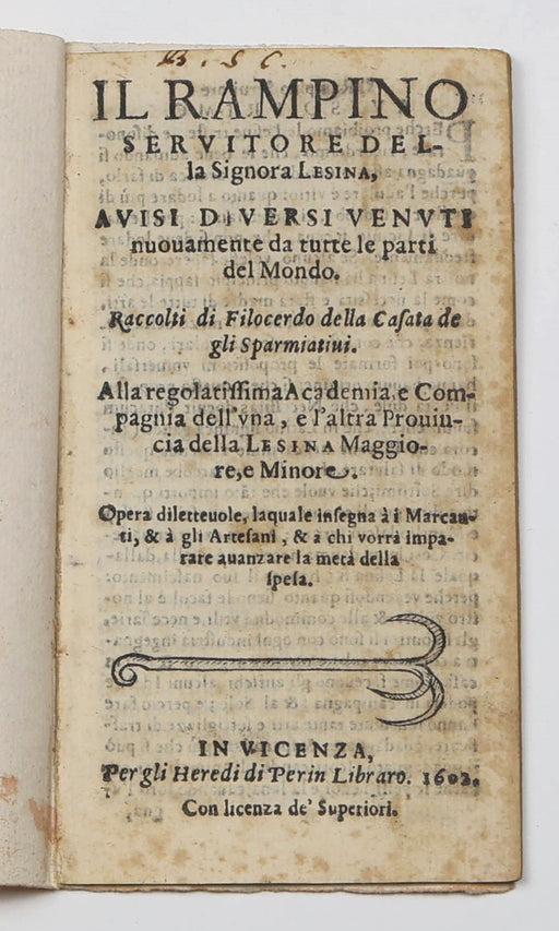 Compagnia della LesinaOriginal price £150.00 - Original price £150.00Original price£150.00£150.00 - £150.00Current price £150.00| /[Compagnia della Lesina:] Il rampino seruitore della signora Lesina, auisi diuersi venuti nuouamente da tutte le parti del mondo. Raccolti di Filoc...