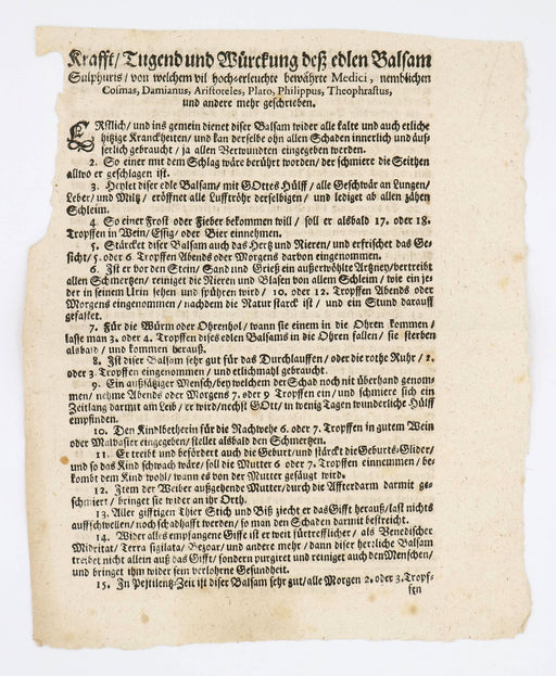 AdvertOriginal price £180.00 - Original price £180.00Original price£180.00£180.00 - £180.00Current price £180.00| /[Advert]: Krafft / Tugend und Würckung deß edlen Balsam Sulphuris [...]. [Germany, late seventeenth or early eighteenth century?] Advert promoting ...
