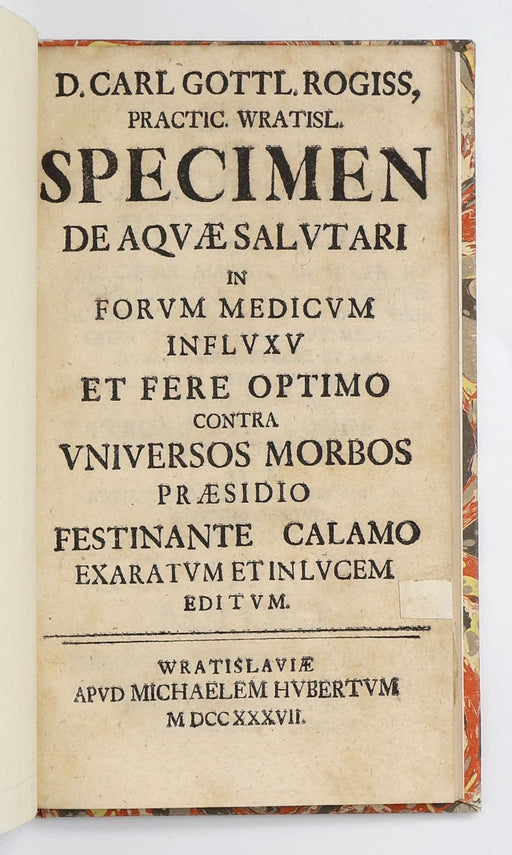 Rogiss, Carl GottliebOriginal price £280.00 - Original price £280.00Original price£280.00£280.00 - £280.00Current price £280.00| /[Water] Rogiss, Carl Gottlieb: Specimen de aquae salutari in forum medicum influxu et fere optimo contra universos morbos, praesidio festinante cal...