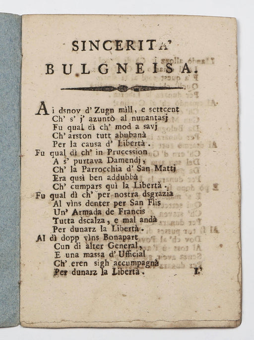 Sincerità BulgneisaOriginal price £395.00 - Original price £395.00Original price£395.00£395.00 - £395.00Current price £395.00| /[Sincerità Bulgneisa] Sincerità bulgneisa. [Bologna]. [c.1799]. Unlocated Bolognese-dialect ballad, most of it a litany of the depredations of the ...