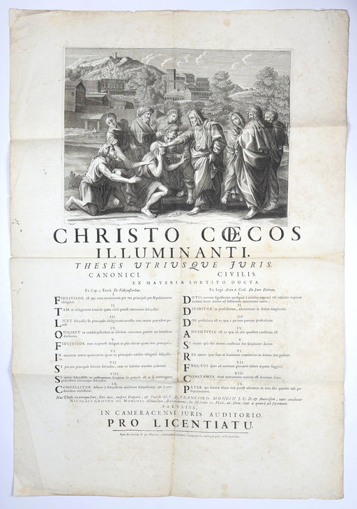 Mongin, François (praes.); Griffon du Monchel, Nicolas (resp.)Original price £750.00 - Original price £750.00Original price£750.00£750.00 - £750.00Current price £750.00| /[Thesis print] Mongin, François (praes.) [Griffon du Monchel, Nicolas (resp.)]: Christo Coecos illuminanti. Theses utriusque juris. Canonici. Civil...
