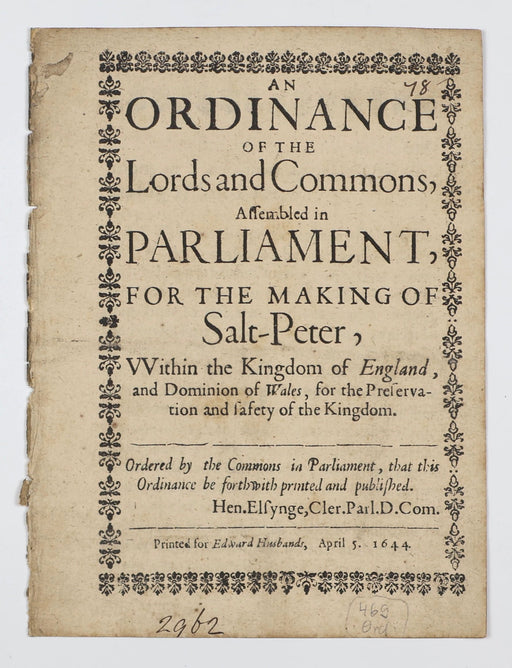 England and Wales, ParliamentOriginal price £275.00 - Original price £275.00Original price£275.00£275.00 - £275.00Current price £275.00| /[Gunpowder] [England and Wales. Parliament]: An Ordinance of the Lords and Commons, assembled in parliament, for the making of Salt-peter, within t...