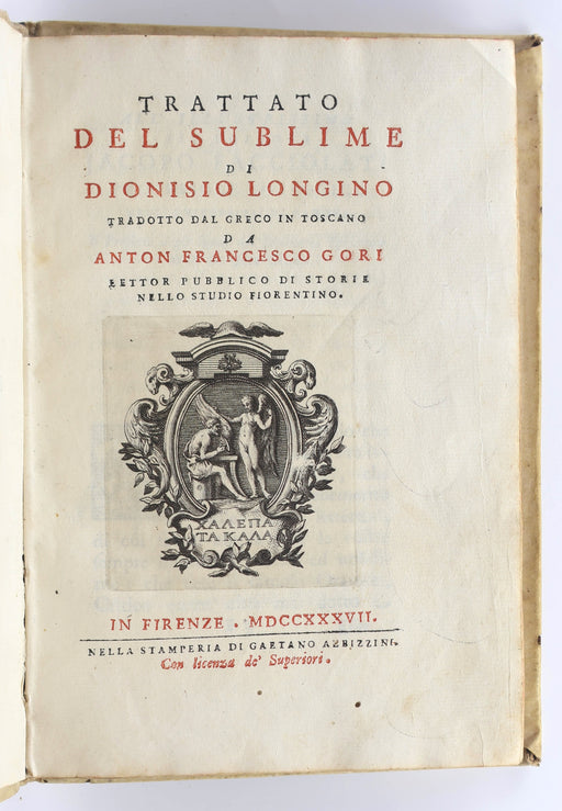 Longinus; Gori, Anton FrancescoOriginal price £250.00 - Original price £250.00Original price£250.00£250.00 - £250.00Current price £250.00| /Longinus: [Gori, Anton Francesco:] Trattato del sublime di Dionisio Longino, tradotto dal Greco al Toscano da Anton Franceso Gori, lettor publico d...