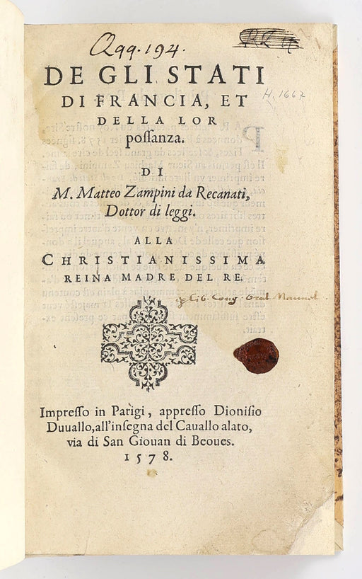 Zampini, MatteoOriginal price £600.00 - Original price £600.00Original price£600.00£600.00 - £600.00Current price £600.00| /Zampini, Matteo: Degli stati di Francia, et della lor possanza [...] Alla Christianissima Reina Madre del Re. Impresso in Parigi, appresso Dionisio...