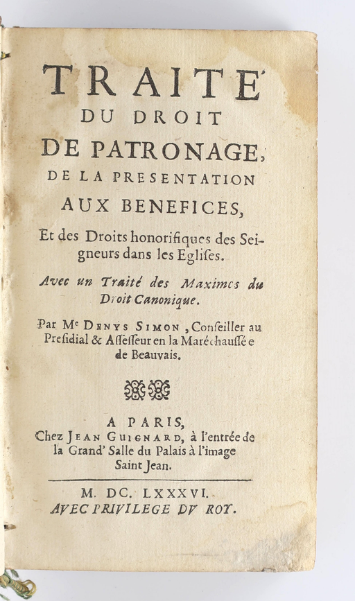 Simon, DenisOriginal price £180.00 - Original price £180.00Original price£180.00£180.00 - £180.00Current price £180.00| /Simon, Denis: Traité du Droit de Patronage, de la Presentation aux Benefices, et des Droits honorifiques des Seigneurs dans les Eglises. Avec un Tr...